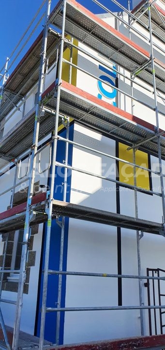 Le traçage des bandes horizontales et verticales de l’esquisse de façade a été réalisé au niveau à bulle, puis recouvert d’un film mince à base de résines acryliques souple le VERTIKAL FMS compte tenu de sa résistance aux teinte soutenues.